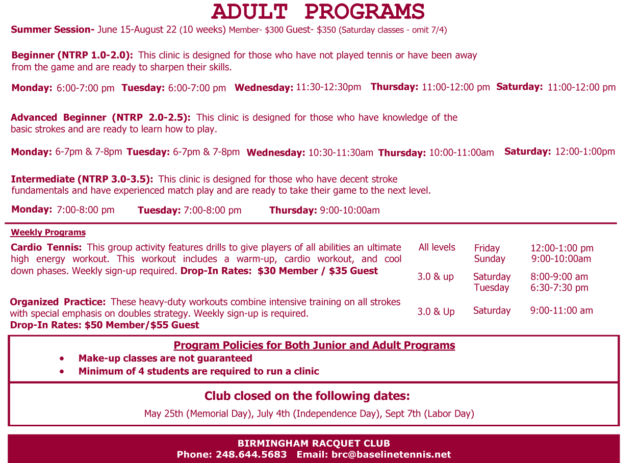 2100 E. LINCOLN BIRMINGHAM MI 48009 | 248-644-5683 | brc@baselinetennis.net
