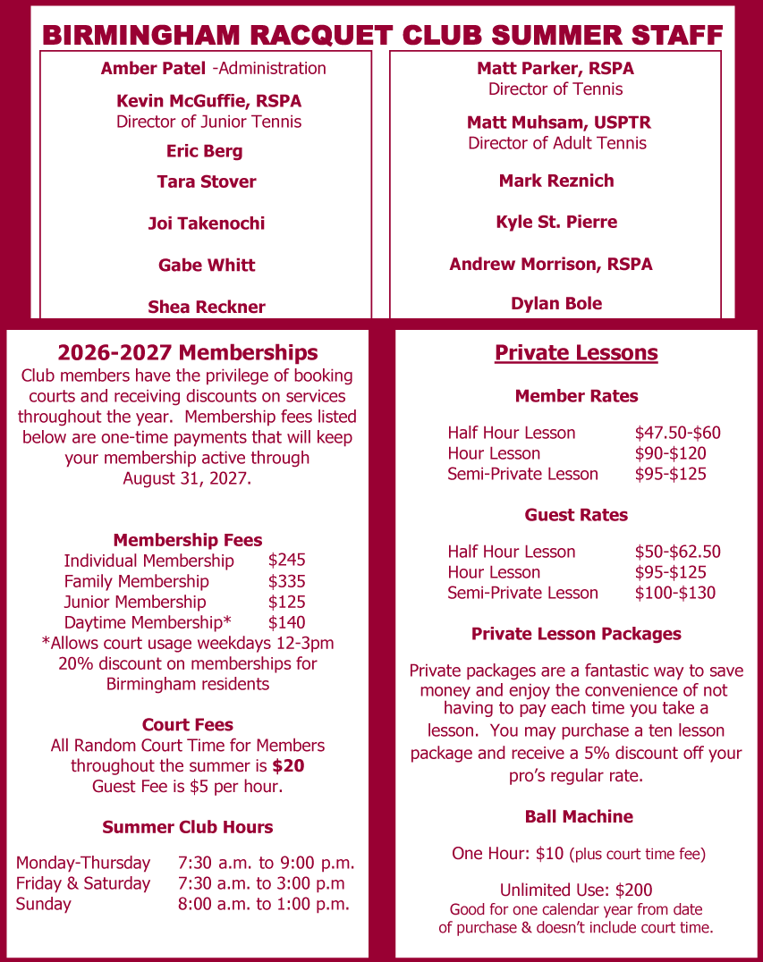 2100 E. LINCOLN BIRMINGHAM MI 48009 | 248-644-5683 | brc@baselinetennis.net